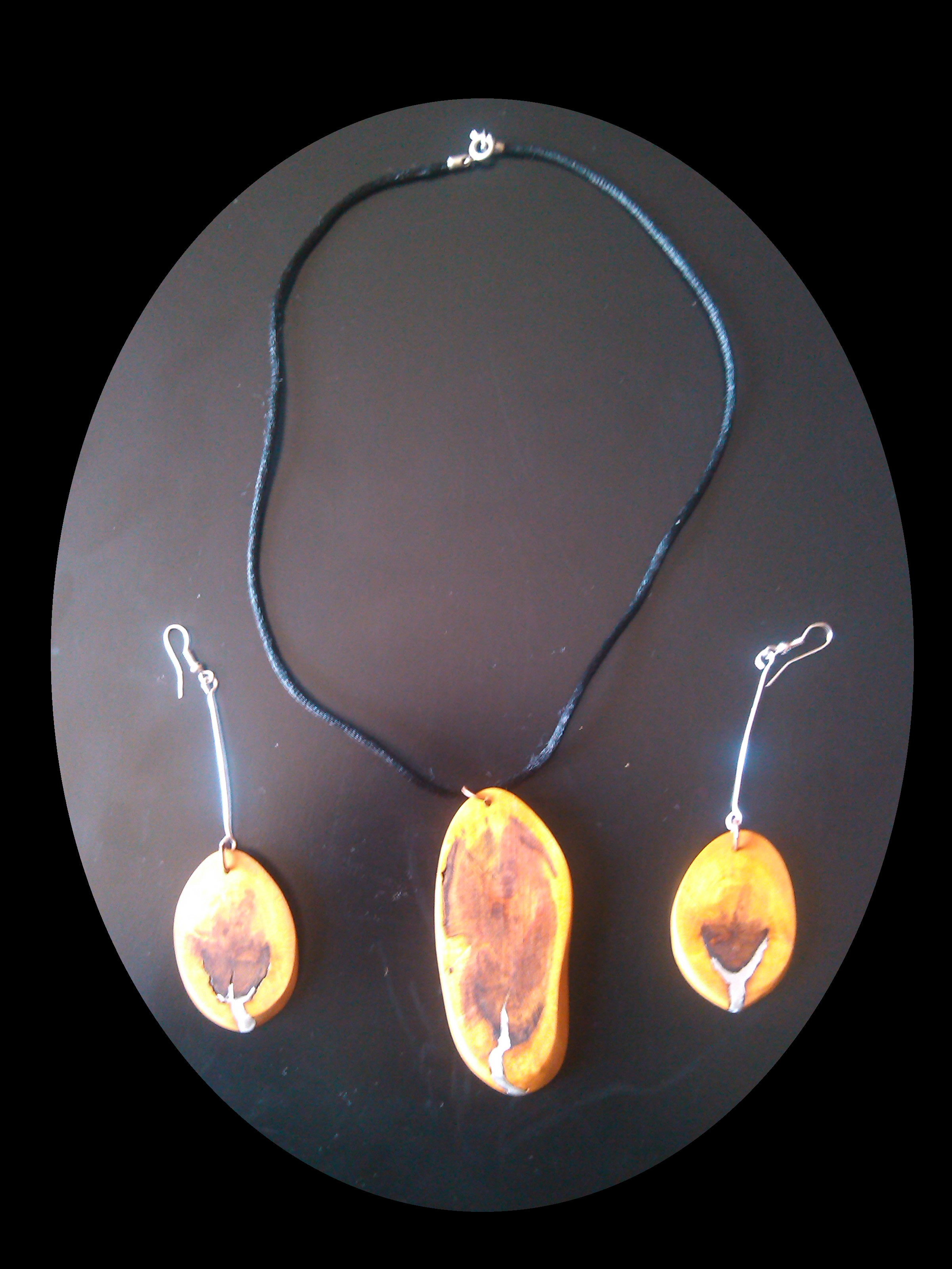 Pendentif et boucles d'oreilles Boucles d'oreilles et pendentif en bois de cerisier avec incrustation d'étain