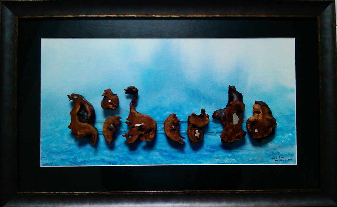 Ecce Homo Cep de vigne avec incrustation d'étain sur aquarelle et bille métallique, 2014