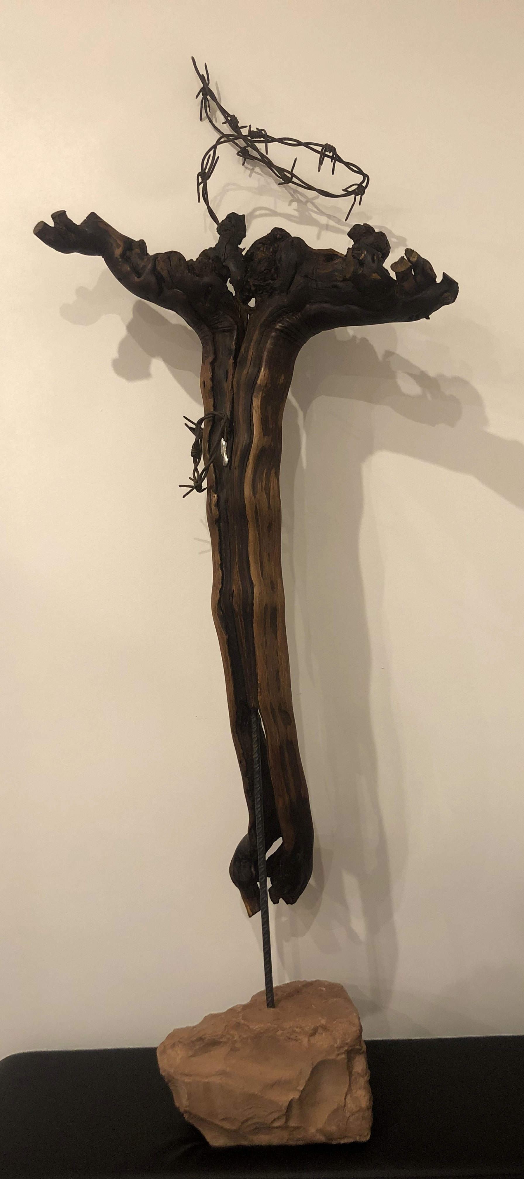 Urbi et Orbi Cep de vigne avec incrustation d'étain, couronne de barbelé de la Première Guerre Mondiale et socle en pierre d'Assise ramassée après le tremblement de terre de 1997, 2022